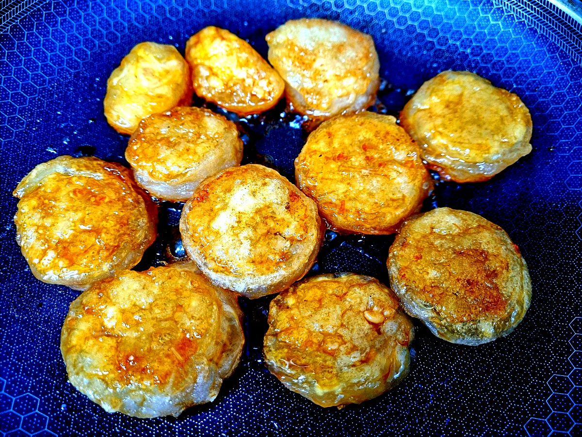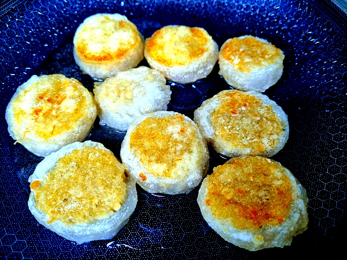팬에 기름을 적당히 두르고 전분을 묻힌 팽이버섯을 튀겨줍니다.