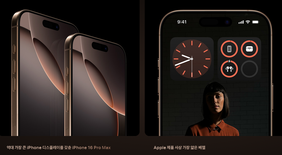 - 아이폰 16 프로 맥스도 6.9인치 Super Retina XDR 디스플레이를 탑재하고 있으며, 항상 켜져 있는 디스플레이와 120Hz ProMotion 기술을 제공합니다. 베젤이 더욱 얇아졌으며, 티타늄 프레임으로 내구성이 강화되었습니다.